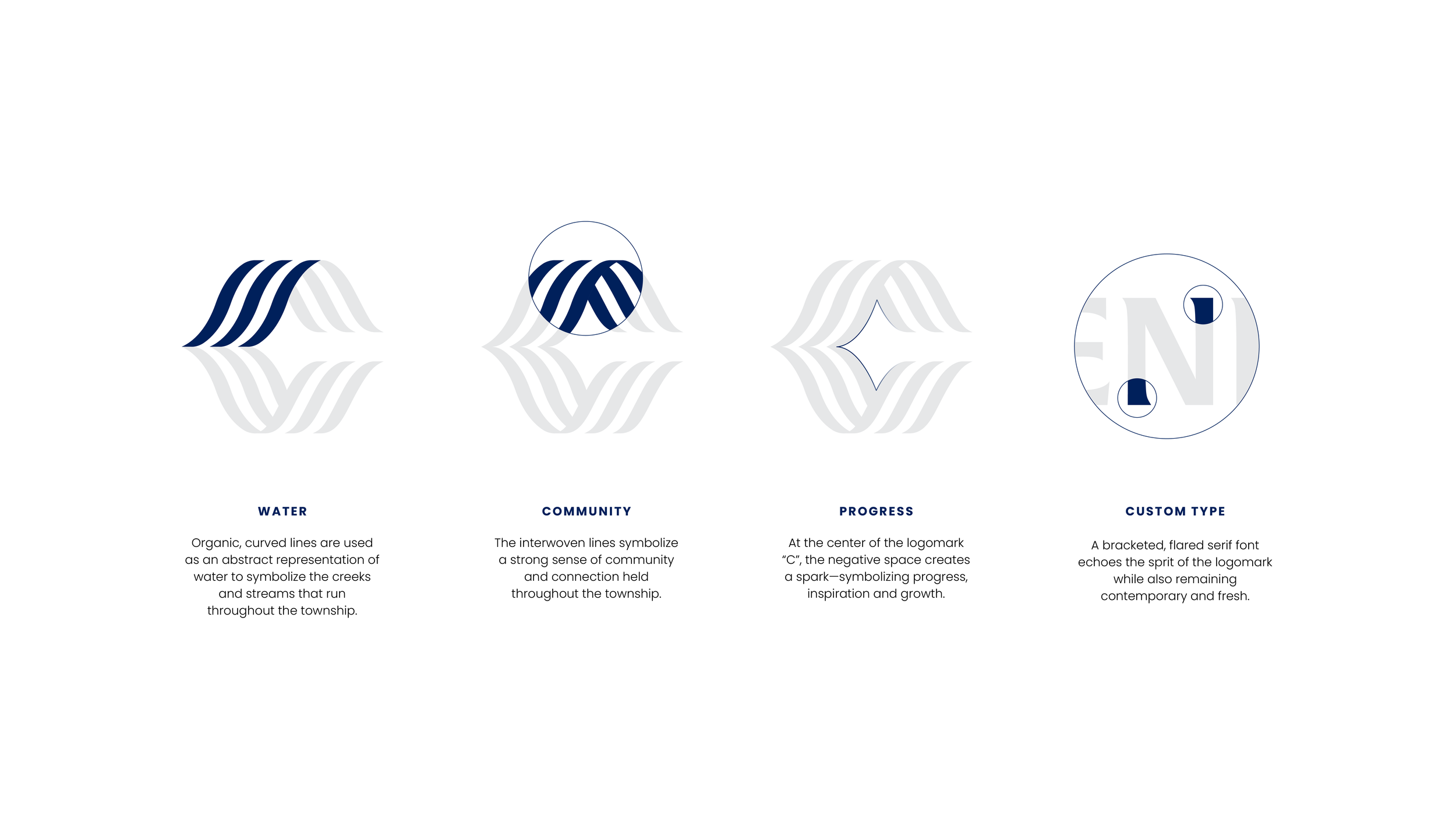 The primary logo features a stylized monogram that serves as a symbol for community, growth and nature. Organic, water-like linework weaves together and creates a spark at the center through negative space. A badge was designed to provide a more contained alternative, while an expressive logotype was created for special applications such as murals and merchandise. Custom lettering is contained within the shape of the township boundary while a stream runs through the middle.
